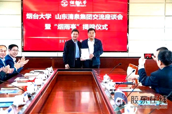 揭牌儀式前,學校領導與清泉集團負責人在育秀大樓316會議室進行座談。張偉書記詳細闡述了學校的發展歷程及與清泉集團的歷史淵源。郭善利校長對清泉集團一直以來的大力支持表示感謝,希望雙方加強合作、互相幫助、共謀發展。張恒傳書記表示,在煙臺大學建校35周年之際捐建煙雨亭,是為了共同銘記清泉與煙大各自35年的成長壯大,感恩大學對清泉在企業發展、文化建設等方面的大力支持。