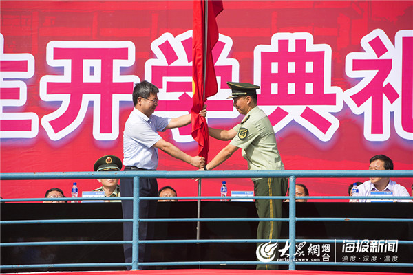 典禮上,煙臺大學黨委書記張偉為軍訓團授旗。
