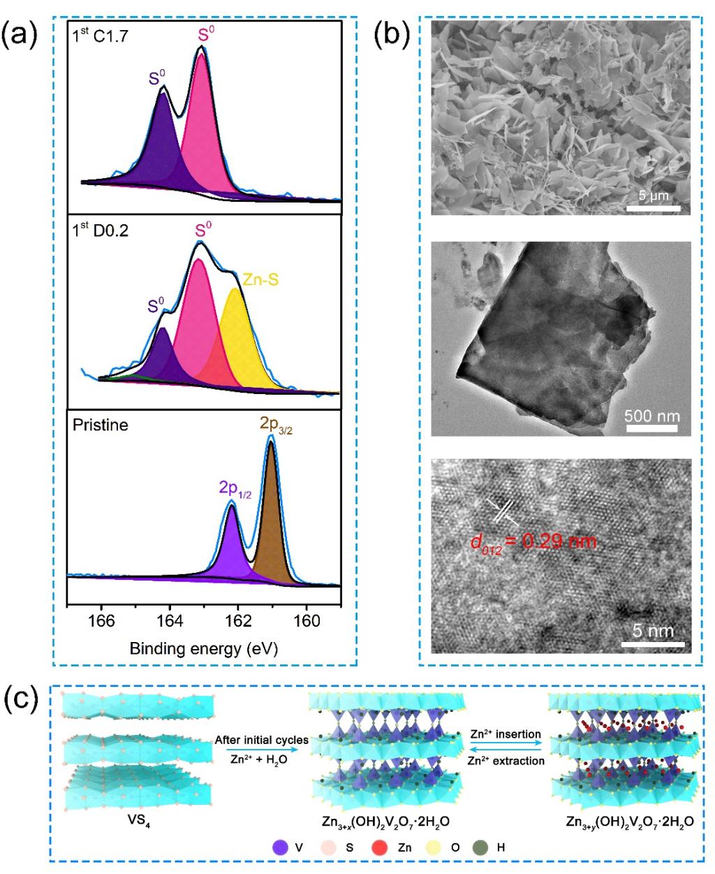 圖1.(a)S 2p非原位XPS,(b)VS4/CNTs電極循環(huán)300圈之后的形貌圖,(c)VS4/CNTs電極在循環(huán)過程中的反應(yīng)機(jī)理示意圖。