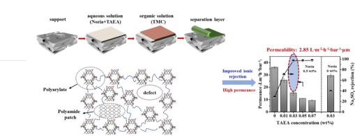 近日,我校化學化工學院趙玉潮教授課題組利用大環分子作為主體構建單元,基于界面聚合反應,通過“打補丁”策略制備了聚芳酯-聚酰胺復合納濾膜。大環分子內部空腔有效降低了水分子傳質阻力,納濾膜滲透率達2.85 L·m?2·h?1·bar?1·μm,硫酸鈉截留率高于96%,且具有優良的耐壓性和長期穩定性。