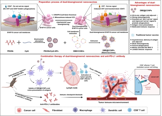 近日,我校藥學院陳大全教授團隊聯合中科院長春應化所、廈門大學田華雨研究員團隊在國際期刊《Bioactive Materials》(IF:16.874)上發表以“CD47KO/CRT dual-bioengineered cell membrane-coated nanovaccine combined with anti-PD-L1 antibody for boosting tumor immunotherapy”為題的研究論文(DOI:10.1016/j.bioactmat.2022.09.017)。本研究設計了一種雙重生物工程化的腫瘤疫苗,增強了腫瘤抗原的免疫原性,在聯合免疫檢查點抑制劑后,有效抑制了腫瘤的生長,為個性化腫瘤疫苗的開發提供了新思路。