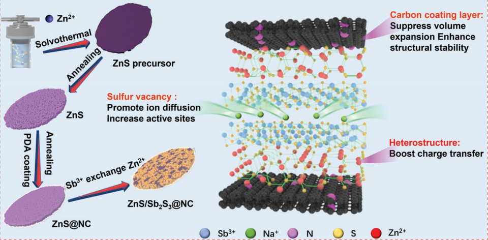 金屬硫化物具有優異的氧化還原可逆性和較高的容量,在SIBs領域中具有廣闊的應用前景。近日,環境與材料工程學院姜付義團隊在國際權威期刊Advanced Functional Materials(IF:19.9)上發表題為《Construction of ZnS/Sb2S3Heterojunction as an Ion-Transport Booster toward High-Performance Sodium Storage》的學術論文。該工作通過陽離子交換法將Sb2S3引入ZnS中,合成了氮摻雜碳包覆的ZnS/Sb2S3(ZnS/Sb2S3@NC)異質結結構。理論計算和實驗研究表明ZnS/Sb2S3@NC異質結結構的構建有效的提升了電荷轉移速率。因此,ZnS/Sb2S3@NC表現出優異的循環穩定性(循環450圈后可逆容量為511.4 mAh g-1)和倍率性能(在10 A g-1電流密度下的可逆容量為400.4 mAh g-1)。此外,通過X射線衍射和高分辨率透射電鏡深入研究了ZnS/Sb2S3@NC的儲鈉機理。最后,組裝了ZnS/Sb2S3@NC//Na3V2(PO4)3/rGO全電池,其在循環50圈后仍具有226.2 mAh g?1的可逆容量。