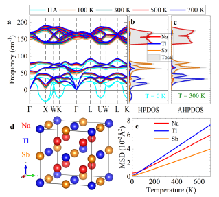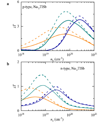 近期,煙臺(tái)大學(xué)物電學(xué)院計(jì)算物理研究團(tuán)隊(duì)聯(lián)合清華大學(xué),中科院物理所在熱電領(lǐng)域取得重要進(jìn)展?;诘谝恍栽碛?jì)算并結(jié)合自洽聲子理論和玻爾茲曼輸運(yùn)方程,研究人員發(fā)現(xiàn)有晃動(dòng)行為的鉈原子的強(qiáng)四次“非諧”性和溫度依賴性對(duì)Na2TlSb的晶格穩(wěn)定性起重要作用,能帶中多谷結(jié)構(gòu)增加了能帶簡(jiǎn)并,并導(dǎo)致p型Na2TlSb超低晶格熱導(dǎo)率和高功率因數(shù)的共存,表明Na2TlSb是熱電應(yīng)用的優(yōu)越候選者。研究成果以“Strong quartic anharmonicity, ultralow thermal conductivity, high band degeneracy and good thermoelectric performance in Na2TlSb”為題,發(fā)表在國(guó)際權(quán)威期刊《NPJ Computational Materials》。