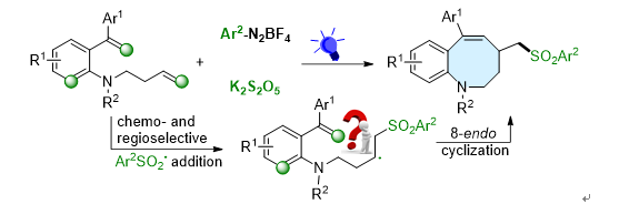 N-雜環化合物是合成和醫藥化學中常見的分子骨架,在世界銷售排名前100的藥物分子中,含氮雜環占比接近一半。因此,N-雜環的有效構建一直是有機合成研究的熱門領域。目前,采用可見光誘導自由基加成環化制備8-/9-元氮雜中環的方法尚無報道。近日,我校化學化工學院有機方法學團隊,孫凱課題組利用可見光誘導自由基串聯環化策略,成功完成了8-/9-元氮雜環的構建工作,并通過DFT計算驗證了反應路徑的合理性,解釋了反應過程中其他競爭反應的不可行性。