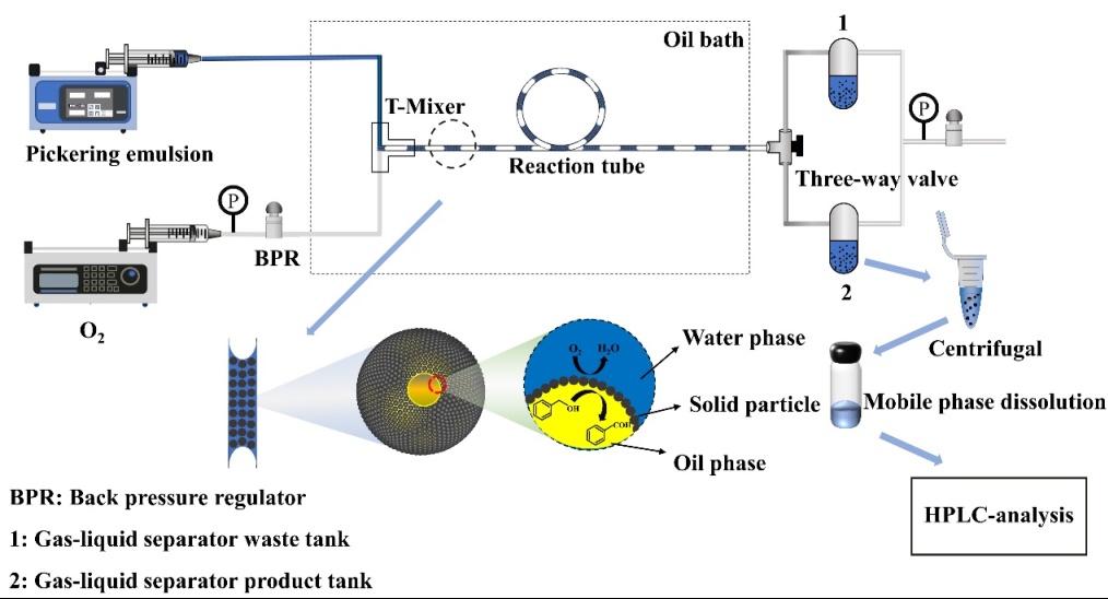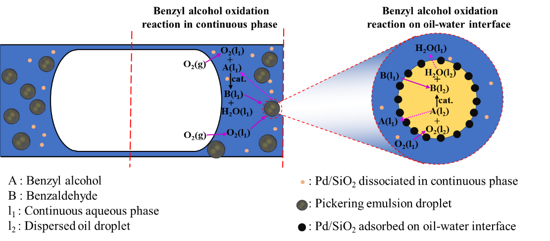近日,我校趙玉潮教授課題組借助Pickering乳液開展了微反應器內苯甲醇氣-液-固多相催化氧化實驗研究,有效避免了固體催化劑顆粒在流動過程中與壁面直接接觸所導致的黏附及堵塞等問題,且該體系具有良好的穩定性。通過操作條件的優化,苯甲醇的轉化率可達86.53%,苯甲醛的選擇性高達99.79%,并分析了Taylor流型下Pickering乳液體系的界面傳質-反應機理。