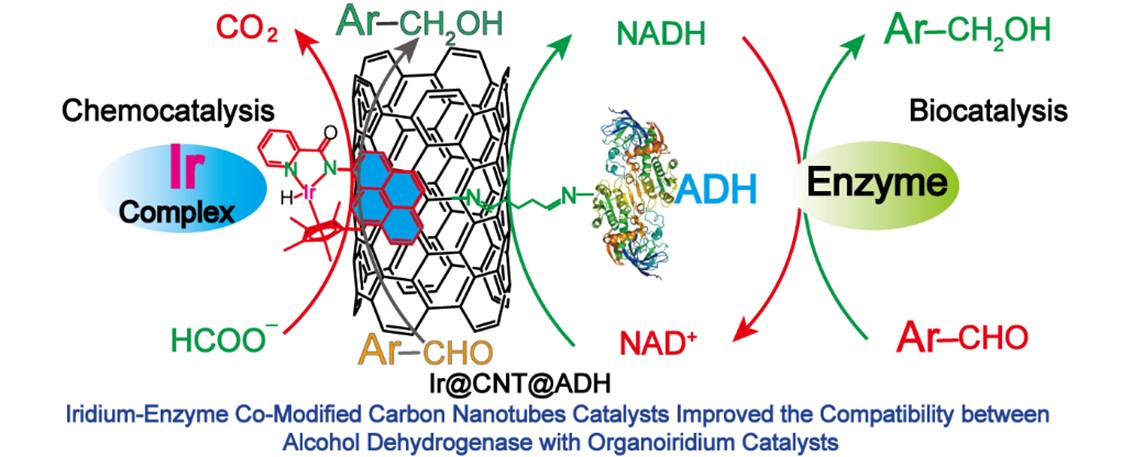 該研究通過兩種相互獨立的溫和偶聯方式,將新型的輔酶NADH再生有機銥絡合物和乙醇脫氫酶(ADH)依次錨定在碳納米管材料表面,發展了一種非均相的有機銥-酶級聯催化劑,顯著改善了有機銥絡合物和含巰基生物酶(ADH)之間的生物相容性問題,實現了酶催化芳香醛制芳香醇過程中,高成本輔酶NAD+/NADH的高效循環利用(圖1)。該成果提出的策略,將有望降低生物合成生產成本,并促進化學-生物協同催化體系的工業應用。上述工作得到了國家自然科學基金(21904131)、煙臺市科技創新發展計劃項目(2023JCYJ075)、山東省自然科學基金(ZR2022MB082, ZR2022QB120, ZR2023MB023)等項目的資助。(文/圖趙立軍)