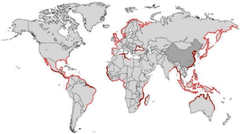 圖1 世界各地入侵藻的分布圖(紅線表示入侵藻的分布)