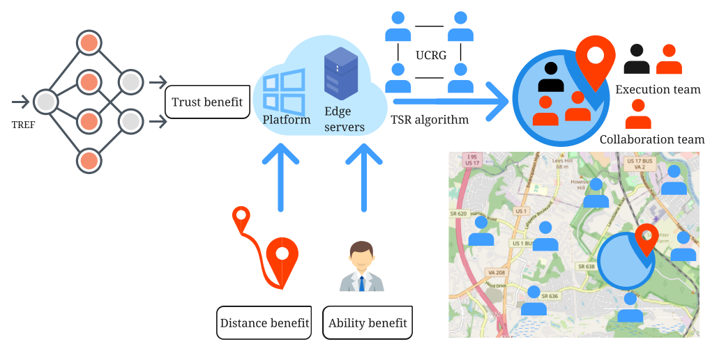 當前,移動眾包(MCS)作為物聯網(IoT)生態系統中的一個重要范例,通過集成多個傳感器和設備實現了集體智能,在城市傳感、環境監測和交通管理等領域發揮著關鍵作用。在協作移動眾包(CMCS)中,面對復雜任務感知的場景,一個關鍵問題是如何招募一個合適的工人團隊來完成任務。為解決這一問題,王瑩潔教授團隊提出了一種創新的CMCS工人招募模型(圖1)。