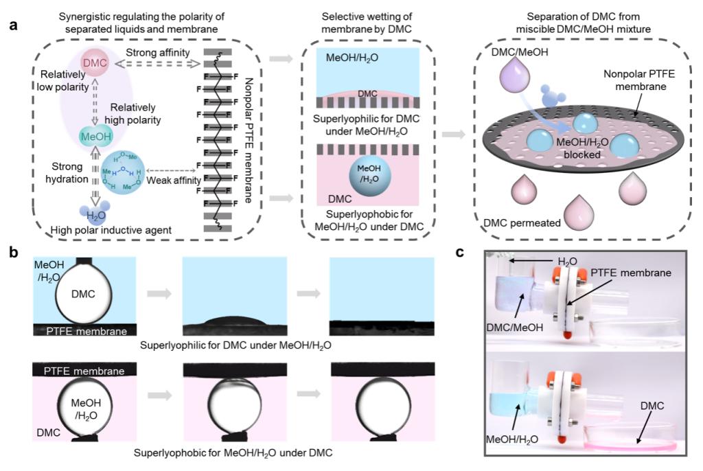 基于此,煙臺大學劉洪亮教授團隊設計開發了一種超浸潤膜分離系統,實現了DMC和MeOH的低能耗、高效分離,分離通量高達1090 L m-2h-1,比傳統的膜分離技術高2-3個數量級。該超浸潤膜分離系統以多孔聚四氟乙烯(PTFE)作為超浸潤膜,環保的水分子(H2O)作為液體誘導劑,協同利用非極性的PTFE多孔膜和較低極性DMC之間的非極性作用以及高極性H2O和較高極性MeOH之間的強氫鍵作用,使DMC快速、選擇性地透過PTFE膜。得益于超浸潤膜易集成的特點,團隊設計了基于超浸潤分離膜和滲透汽化膜的膜分離組件,DMC的純度大于99.4 wt%,在DMC的實際生產中展現了巨大潛力。