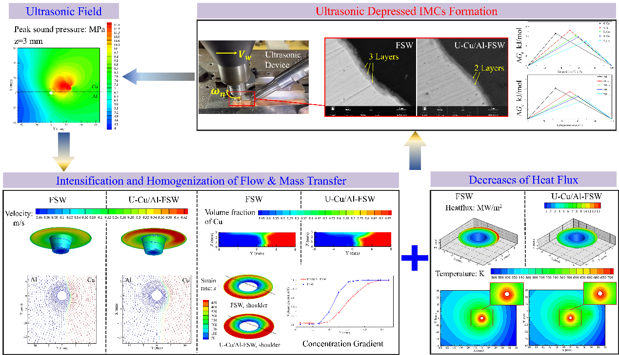 鋁銅異質材料的焊接對于電氣設備、運輸和化學工業的制造非常重要。而金屬間化合物層的厚度和分布一直是Al/Cu接頭質量控制的技術難題。近日,核裝備與核工程學院在Top期刊International Journal of Mechanical Sciences(IF:7.3)上發表學術論文《Mechanism of ultrasonic effects on thermal-stress field in Cu/Al-FSW process》。該工作首次模擬了超聲輔助Al/Cu攪拌摩擦焊的超聲場與焊接多能場耦合過程。通過數值模擬和宏微觀組織演化分析相結合,從焊接熱過程的變化和高溫高應變速率下的流變特性等方面闡明了超聲在Al/Cu攪拌摩擦焊過程中對金屬間化合物的抑制機理。揭示超聲優化接觸界面以及剪切層熱力狀態的機制。