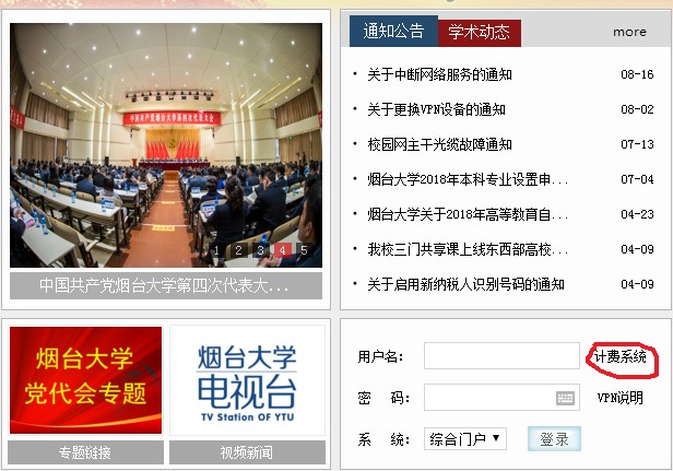 在瀏覽器中打開煙臺大學官網http://www.gootrk.xyz,點擊右下“計費系統”