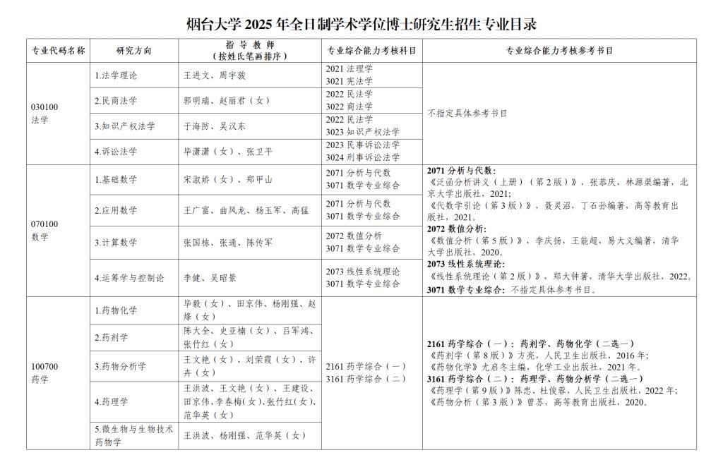 我校招生專業為法學、數學、藥學3個學術學位全日制博士研究生專業。具體專業研究方向詳見《煙臺大學2025年全日制學術學位博士研究生招生專業目錄》。
