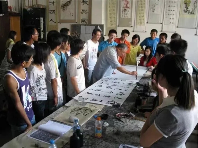 說(shuō)到書畫協(xié)會(huì),那就不得不提到其中的靈魂人物——韓冬冰老師。如果把韓老師比作太陽(yáng),那同學(xué)們就是被溫暖光芒不斷照耀的行星。每至清晨或傍晚,在大學(xué)生活動(dòng)中心,總能看到一道靚麗的風(fēng)景線——許多學(xué)生團(tuán)團(tuán)簇?fù)碓陧n老師身邊,一路跟隨他,聆聽他……