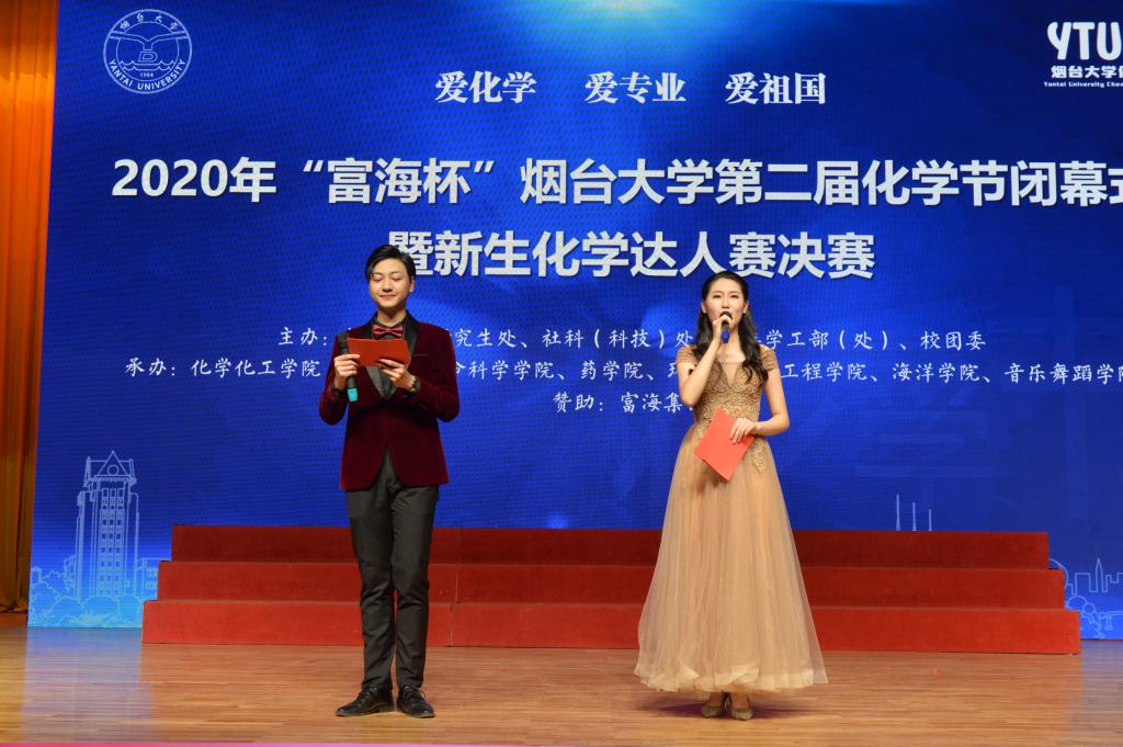 12月6日晚,煙臺大學2020年“富海杯”第二屆化學節閉幕式暨新生化學達人賽決賽,在弘毅廳落下帷幕。本次化學節由學校教務處、研究生處、社科(科技)處、黨委學工部、校團委主辦,化學化工學院承辦,生命科學學院、藥學院、環境與材料工程學院、海洋學院、音樂舞蹈學院協辦,以“愛化學、愛專業、愛祖國”為主題,體現了將興趣與專業相結合、文化建設與學風建設相結合的理念。