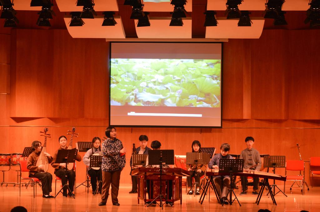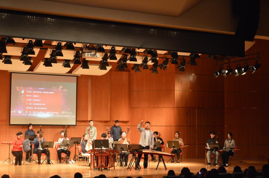 談及舞臺劇策劃初衷,姚金佳表示,民樂合奏課存在學(xué)生水平不一、樂種不齊、課時較少、各專業(yè)聲部不均衡等情況,不利于傳統(tǒng)大合奏的排演形式。為了讓學(xué)院全體學(xué)生都有登臺演出實(shí)踐的機(jī)會,創(chuàng)新性地將民樂合奏舞臺劇化,我們采取了“學(xué)生自愿+競選”的方式,將每首樂曲分配給最適合的學(xué)生,采取小組合形式進(jìn)行排演。按劇情需要加入聲樂、舞蹈,部分演奏者會有臺詞、表演,練習(xí)曲目相對少而精,突顯學(xué)生個人展示,練習(xí)更有動力。