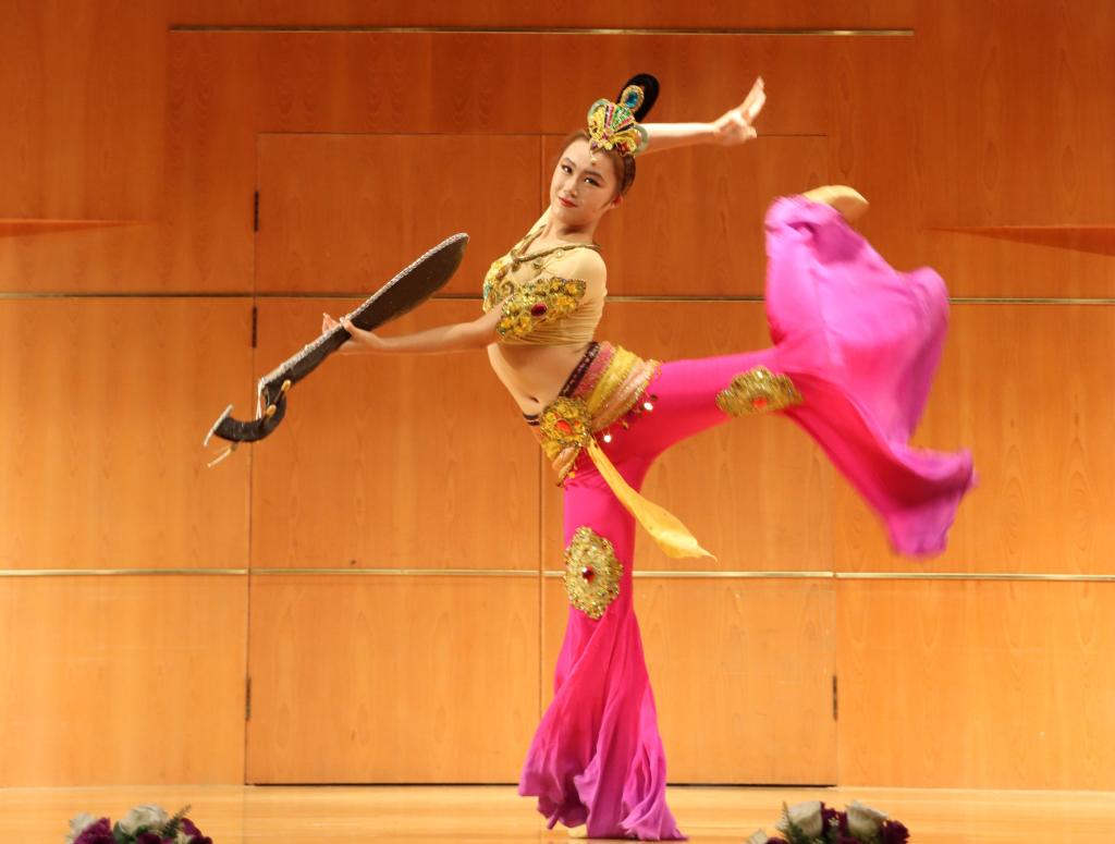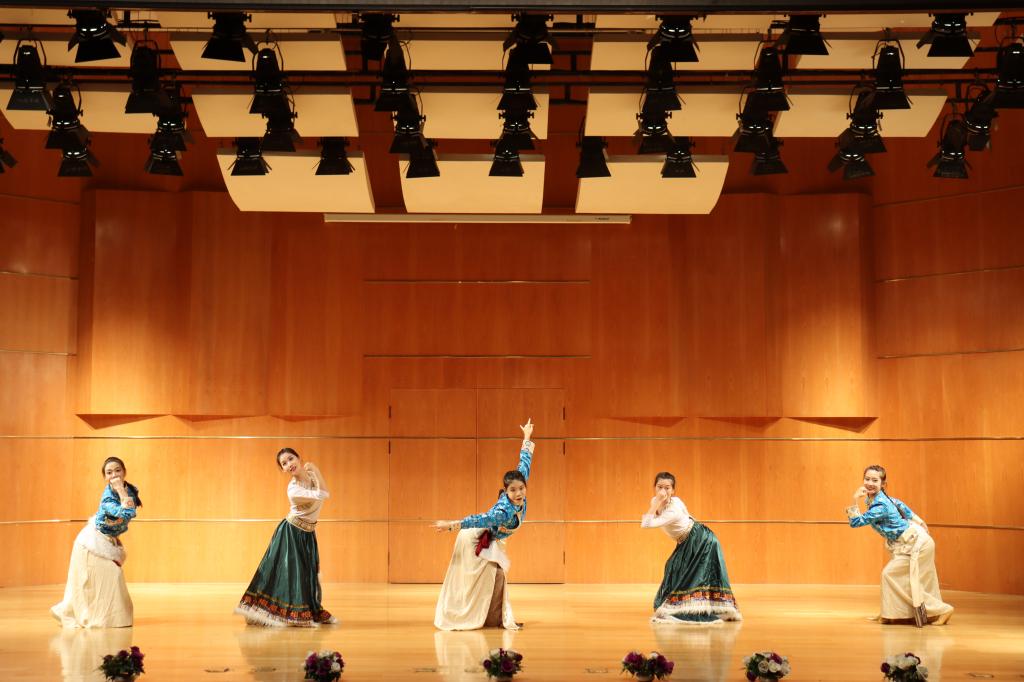 九曲黃河,奔騰向前,四部合唱《黃水謠》描寫了奔流不息的黃河之水,描繪著人們在美麗肥沃的土地上辛勤耕耘的景象。獨唱《雪白的鴿子》,舞蹈《馬爾康的姑娘》《反彈伎樂天》,展現了青海、寧夏、甘肅等地的獨特藝術表現形式,共同映照出中華民族自強不息、奮斗不止的品格。西洋管弦五重奏《游擊隊歌》,熟悉的旋律響起,描繪了機智勇敢的游擊隊員的藝術形象,表達了堅韌不屈的民族精神。嗩吶《天府好》、歌舞《沂蒙頌》充分挖掘黃河特色,生動演繹黃河故事,每一個作品傳遞的信念和精神,在音樂聲中娓娓道來,深深感染著現場師生。演出在歌曲《國家》中落下帷幕。