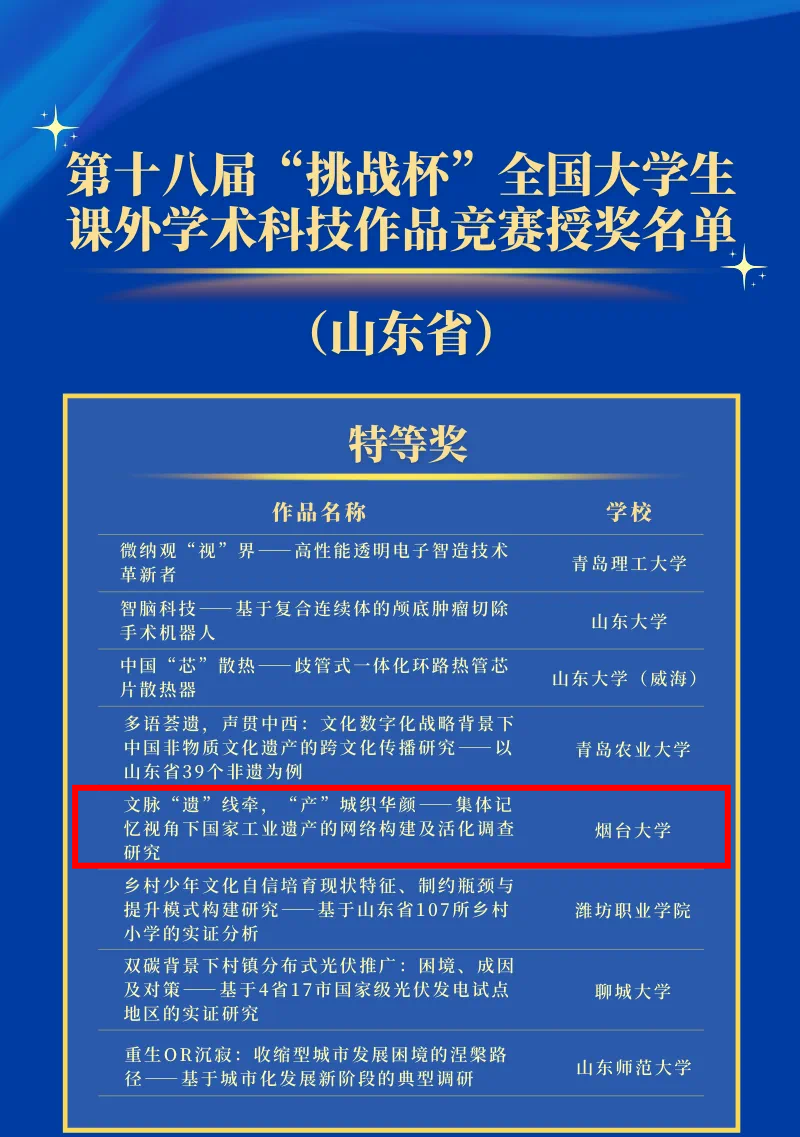 煙大學子獲第十八屆“挑戰杯”全國大學生課外學術科技作品競賽特等獎