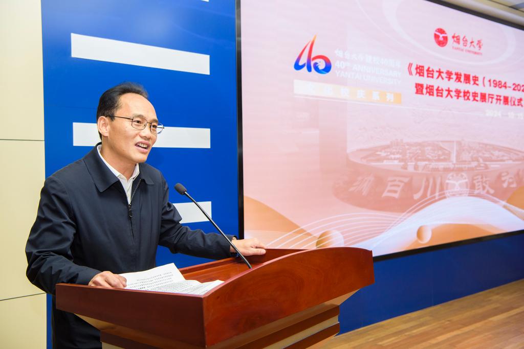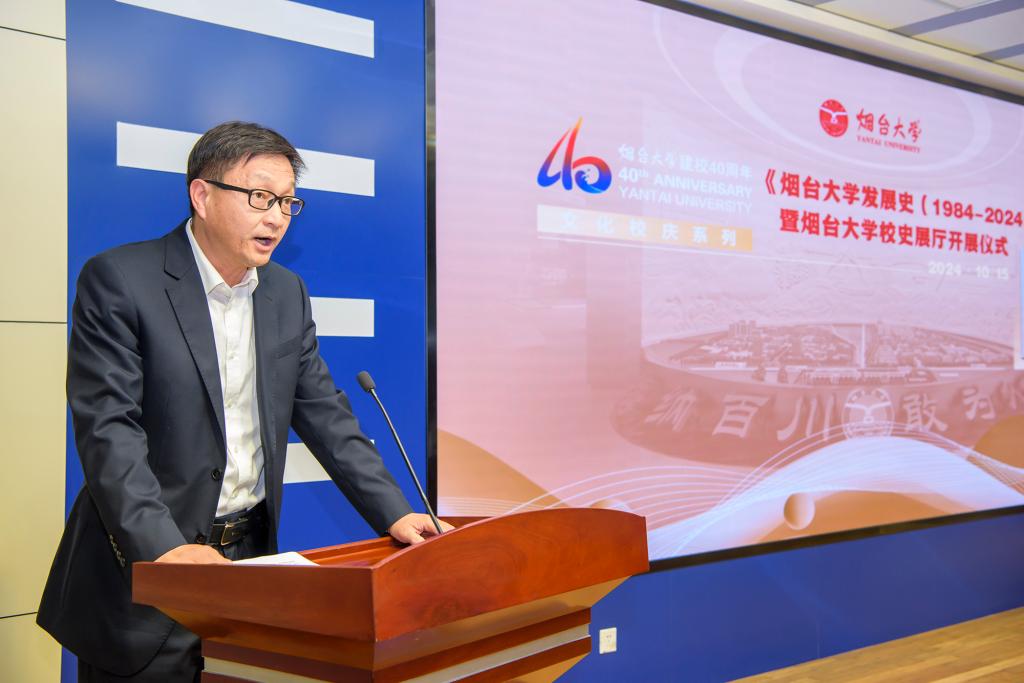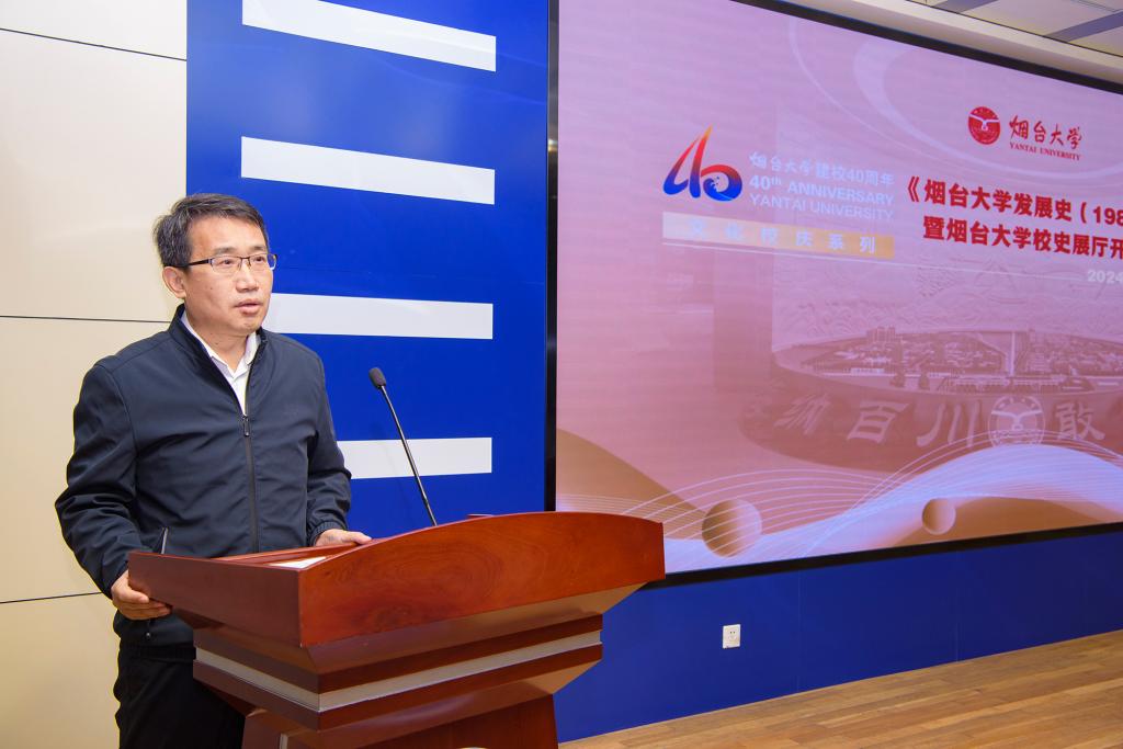 盧國強代表學(xué)校黨委對發(fā)展史出版和校史展廳開展表示熱烈祝賀,向所有參與這項工作的同志們的辛勤付出表示衷心感謝。他指出,在煙臺大學(xué)建校40周年之際,在學(xué)校成功實現(xiàn)博士學(xué)位授予單位重大突破、站上新的發(fā)展賽道之時,全面系統(tǒng)梳理建校歷史、客觀深刻總結(jié)辦學(xué)經(jīng)驗、生動立體講述發(fā)展故事,對于把握歷史主動、錨定奮斗目標,進一步增強建設(shè)高水平大學(xué)的信念和信心,汲取高質(zhì)量發(fā)展的智慧和力量,團結(jié)鼓舞全體煙大人在新的歷史起點上奮進新征程、建功新時代具有重要歷史意義。他強調(diào),記錄學(xué)校40年辦學(xué)足跡的《煙臺大學(xué)發(fā)展史(1984-2024)》和展示學(xué)校40年發(fā)展時光的校史展廳是學(xué)校校史研究的重要成果,是文化建設(shè)的標志性工程,是持續(xù)發(fā)展的寶貴精神財富。希望全校廣大干部師生以此次發(fā)展史編寫出版和校史展廳重建開展為契機,深入學(xué)習(xí)校史,全面了解校情,增強榮校愛校意識,傳承和發(fā)揚好煙大優(yōu)良傳統(tǒng),并堅持與時俱進、繼往開來、開拓創(chuàng)新,圍繞學(xué)校第五次黨代會確立的奮斗目標,貫徹落實“一五八一”總體部署,在加快建成特色鮮明、開放創(chuàng)新、國內(nèi)外具有重要影響力的高水平大學(xué)的新征程上共同創(chuàng)造和書寫好屬于我們這一代煙大人的光榮歷史。