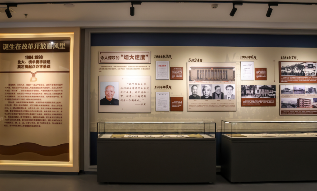 其中,《煙臺大學(xué)發(fā)展史(1984-2024)》一書由山東人民出版社精裝出版,全書共60萬字,分為序、第一篇開創(chuàng)(1984-1990)、第二篇中流(1991-2011)、第三篇新局(2012-2024)、大事記、附錄等5個部分,全面系統(tǒng)總結(jié)了煙臺大學(xué)40年來植根齊魯文化沃土、傳承北大清華基因、弘揚改革開放精神、勇?lián)逃龔妵姑膴^進歷程,客觀詳實記錄了歷代煙大人“與改革開放時代同行、與教育強國建設(shè)共進”的奮斗故事。重建后的煙臺大學(xué)校史展廳面積720平米,分為序廳、正廳、尾廳三個部分。其中,序廳由主題浮雕墻、“一校三區(qū)”校園沙盤和學(xué)院名稱墻組成;正廳分為“誕生在改革開放春風(fēng)里”“航行在跨世紀浪潮中”“奮進在新時代征程上”三個篇章,生動立體講述學(xué)校三個歷史時期的發(fā)展故事和辦學(xué)成就;尾廳包含歷任學(xué)校領(lǐng)導(dǎo)、校友風(fēng)采、領(lǐng)導(dǎo)關(guān)懷照片墻和結(jié)語。