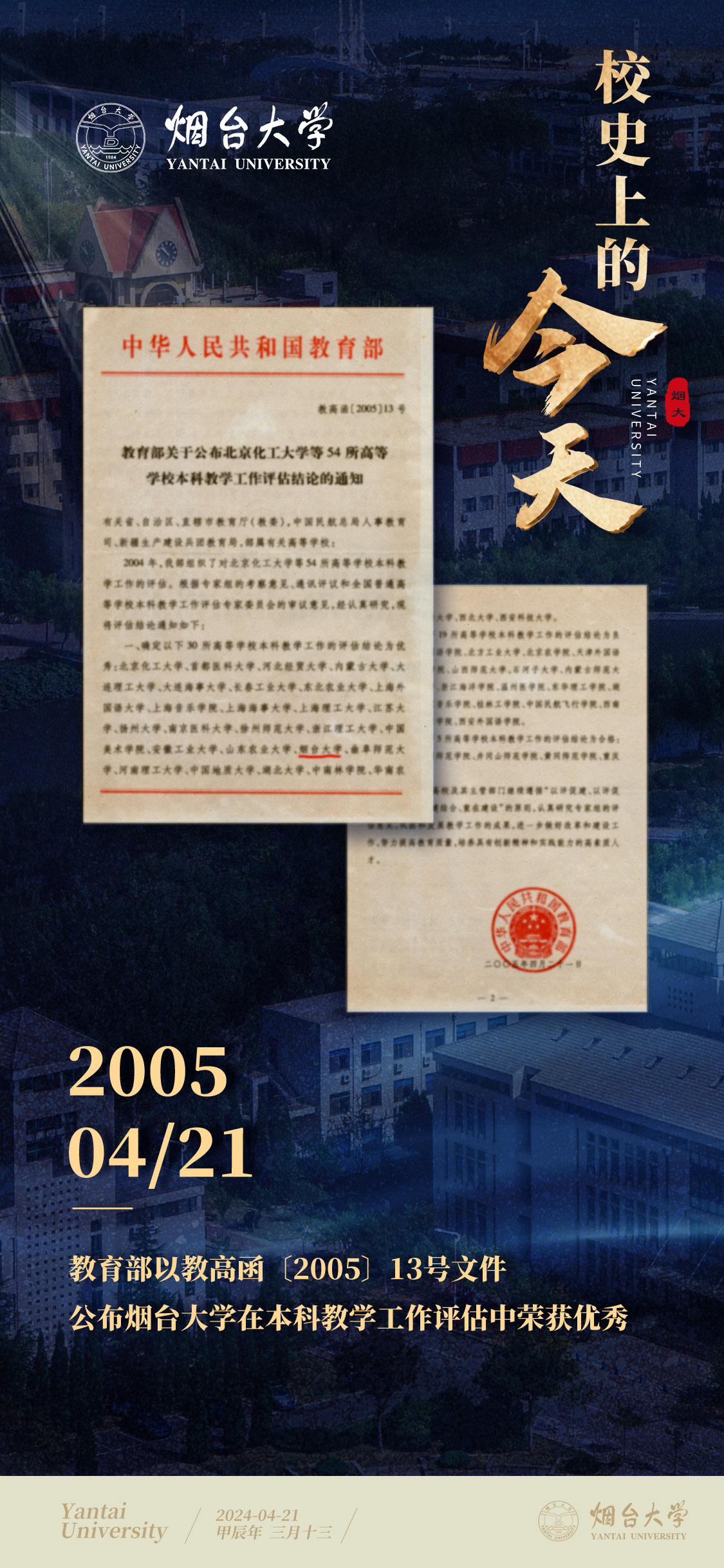 【編者按】2024年是新中國成立75周年,也是煙臺(tái)大學(xué)建校40周年。40年來,誕生于改革開放時(shí)代大潮中的煙臺(tái)大學(xué),扎根齊魯文化沃土,傳承北大清華基因,弘揚(yáng)改革開放精神,勇?lián)逃龔?qiáng)國使命,書寫了一段段滋蘭樹蕙的育人故事,譜寫了一曲曲乘風(fēng)破浪的奮進(jìn)贊歌。為慶祝煙臺(tái)大學(xué)建校四十周年,新聞中心(融媒體中心)推出“校史上的今天”欄目,以時(shí)間為線索,擷取煙大建校發(fā)展史上具有代表意義的重大事件,重溫閃耀在歷史長河中的昔年今朝,追憶在鹽堿灘上白手起家、艱苦創(chuàng)業(yè)的崢嶸歲月,展現(xiàn)辦學(xué)歷程中取得的新發(fā)展成就,啟迪新時(shí)代煙大人在新征程中再創(chuàng)新輝煌。