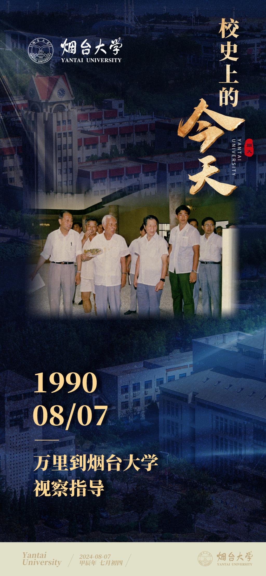 1990年8月7日上午,時任全國人大常委會委員長萬里到煙臺大學(xué)視察指導(dǎo),并與省市、北大、清華、煙大領(lǐng)導(dǎo)同志座談。當(dāng)天下午,煙大舉行慶祝建校六周年大會,成立北京大學(xué)、清華大學(xué)支援煙臺大學(xué)建設(shè)委員會,同時北大、清華完成援建任務(wù)撤回北京。萬里這次視察對煙臺大學(xué)平穩(wěn)過渡、健康發(fā)展,對北大、清華繼續(xù)援建,對省市共同支持煙臺大學(xué)等諸多方面都起了重要作用。