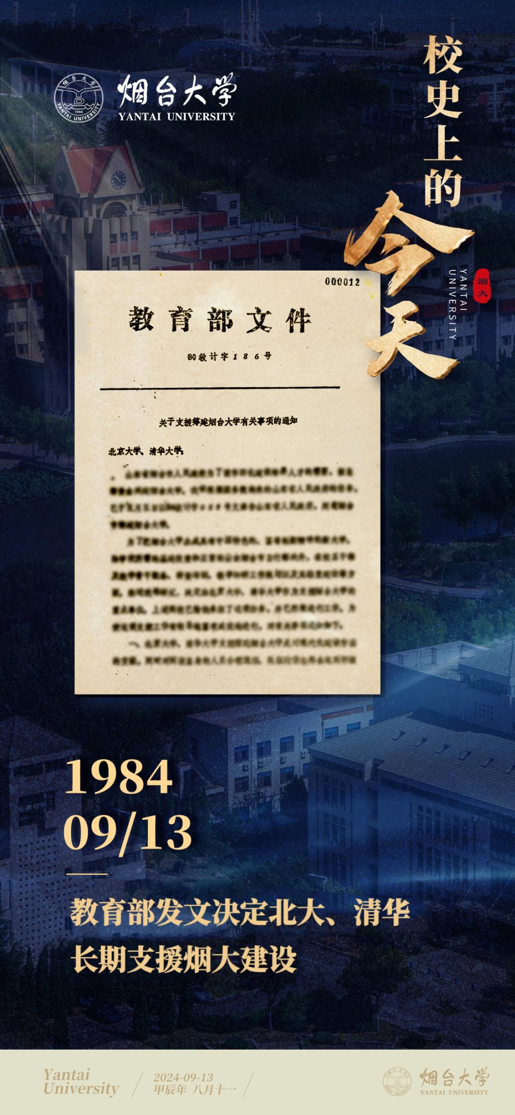 1984年9月13日,教育部以(84)教計字186號文件《關于支援籌建煙臺大學有關事項的通知》的形式給北京大學、清華大學發文,正式決定由北京大學、清華大學作為支援煙臺大學的重點單位。《通知》指出,為了把煙臺大學辦成具有中國特色的、富有創新精神的新大學,經教育部研究決定,除建校所需的基建投資和正常經費由煙臺市自行解決外,煙臺大學在校系干部及教學骨干配備、師資培訓、教學科研工作規劃以及實驗室建設等方面由北京大學、清華大學重點支援。上述兩校已愉快承擔了這項任務,并已積極進行工作。為使這項支援工作有效進行,對有關事項通知如下。