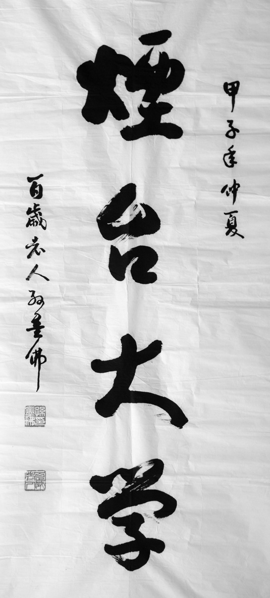孫墨佛是跨越清朝、民國和新中國三個時代的著名書法家,曾擔任過孫中山大元帥府參軍,解放后任中央文史研究館館員。1984年仲夏之際,年屆百歲的孫墨佛先生回到他闊別50多年的故鄉萊陽。他的到來引起當地政府和文化界的高度重視。時任煙臺市委書記的王濟夫不僅愛好書法,本人也是書法大家,他在煙臺東山賓館會見了孫墨佛,并請孫老先生為新建的煙臺大學題寫校名。這位已滿百歲的辛亥革命老人欣然應允,成為第一位題寫煙臺大學校名的著名書法家。三年后,孫老先生仙世,享年104歲,是為煙臺大學題寫校名的年齡最長者。