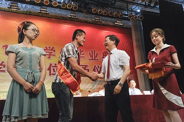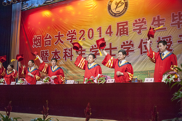 典禮在雄壯的國歌聲中拉開帷幕。典禮上宣讀了《煙臺大學關于表彰2014屆優秀畢業生的決定》《煙臺大學關于表彰基層就業先進個人的決定》,學校領導為省級優秀畢業生代表頒獎。黨委書記崔明德為16名榮獲“基層就業先進個人”的畢業生頒發榮譽證書、披掛綬帶,一一握手,勉勵他們扎根基層建功立業。