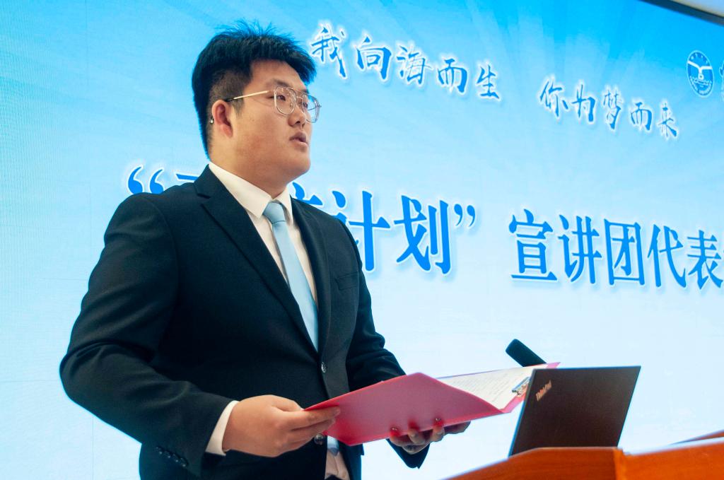 隨后,校團委書記張巖對“引航計劃”籌備情況和實踐活動方案作了介紹。“引航計劃”宣講團代表、機電汽車工程學院學生袁慶鵬發出“追逐光、成為光、散發光”的青春倡議。“引航計劃”宣講團代表、物理與電子信息學院學生蘇振宇結合宣講材料和個人成長經歷進行現場路演。