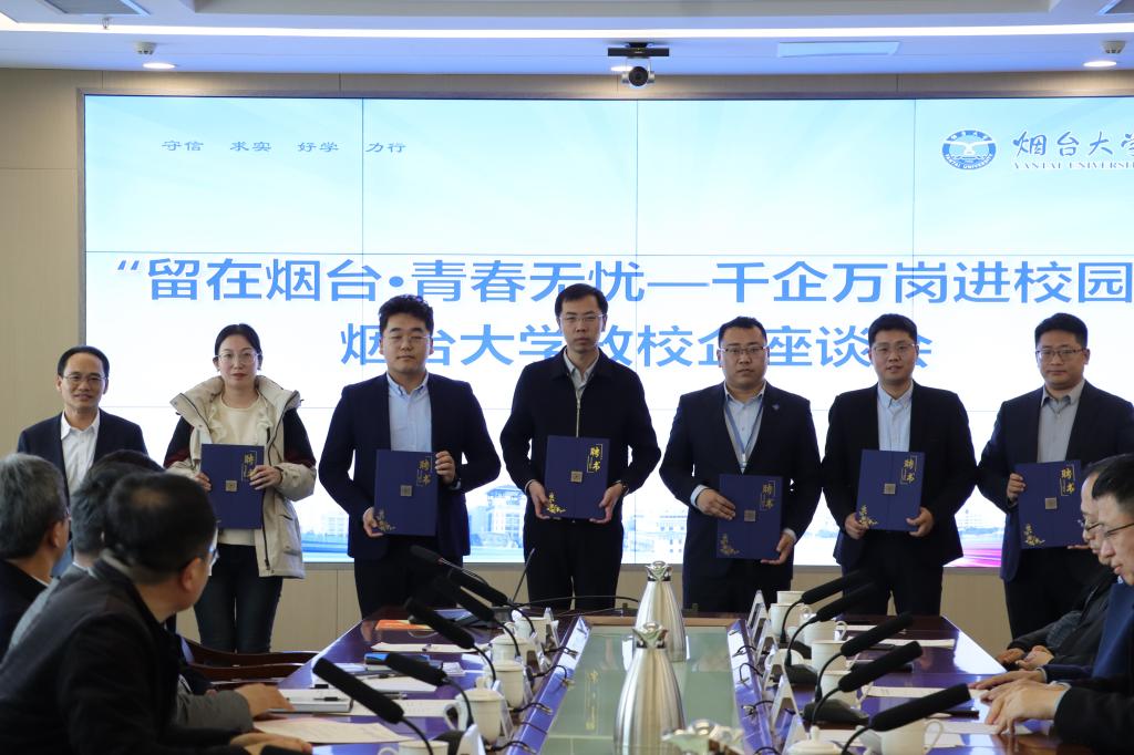 活動過程中,煙臺市公共就業和人才服務中心負責人、煙臺黃渤海新區人社局負責人、校領導、各學院及部門負責人分別在主校區和八角灣校區與東方化學、道恩集團、中集來福士、艾創機器人等10余家企業開展座談交流,進行企業和人才需求推介,就人才培養、學科建設、校企合作等方面深入探討并向重點企業代表頒發職業指導(就業創業)導師聘書。