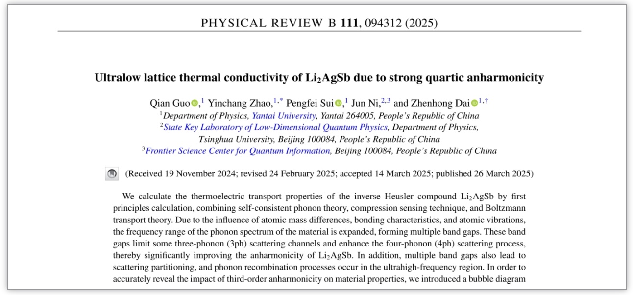 【本站訊】4月初,物理與電子信息學院2023級碩士研究生郭倩為第一作者,物理與電子信息學院趙銀昌教授和戴振宏教授為通訊作者,煙臺大學為第一單位,在國際物理權威期刊《Physical Review B》發表題為“強四次非諧性導致Li2AgSb具有超低晶格熱導率”的論文。