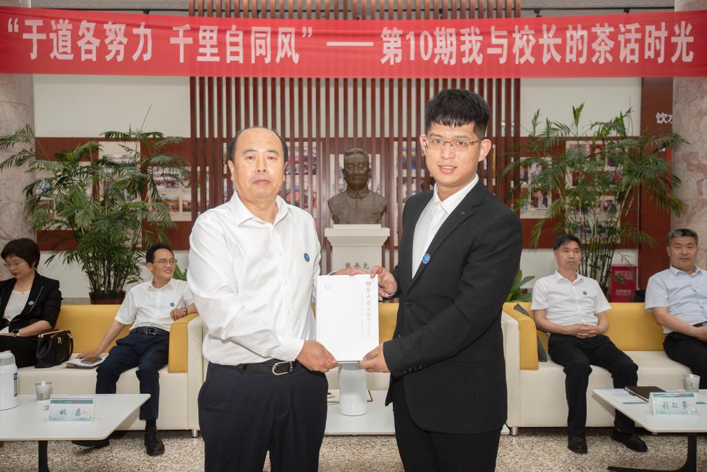 【本站訊】“我來自一個經濟困難家庭,是國家和學校的獎助政策照亮了我的求學之路,讓我相信寒門學子也能綻放光芒”“從四度折戟的論文低谷到文章被SCI一區期刊錄用的曙光初現,是導師的鼓勵點燃了我的堅持,讓我叩開了名校博士研究生之門”……6月11日下午,承先圖書館二樓大廳氣氛溫馨融洽,充滿歡聲笑語,第10期“我與校長的茶話時光”(畢業季專場活動在此舉行。來自21個學院的本科畢業生和研究生畢業生代表與學校領導圍坐一堂,共話成長歷程,暢談未來理想,為母校發展建言獻策。黨委副書記、校長郝曙光,黨委常委、副校長馮素玲、姚昌、張獻勇、王麗、初磊出席活動并為畢業生送上祝福。活動由馮素玲主持。