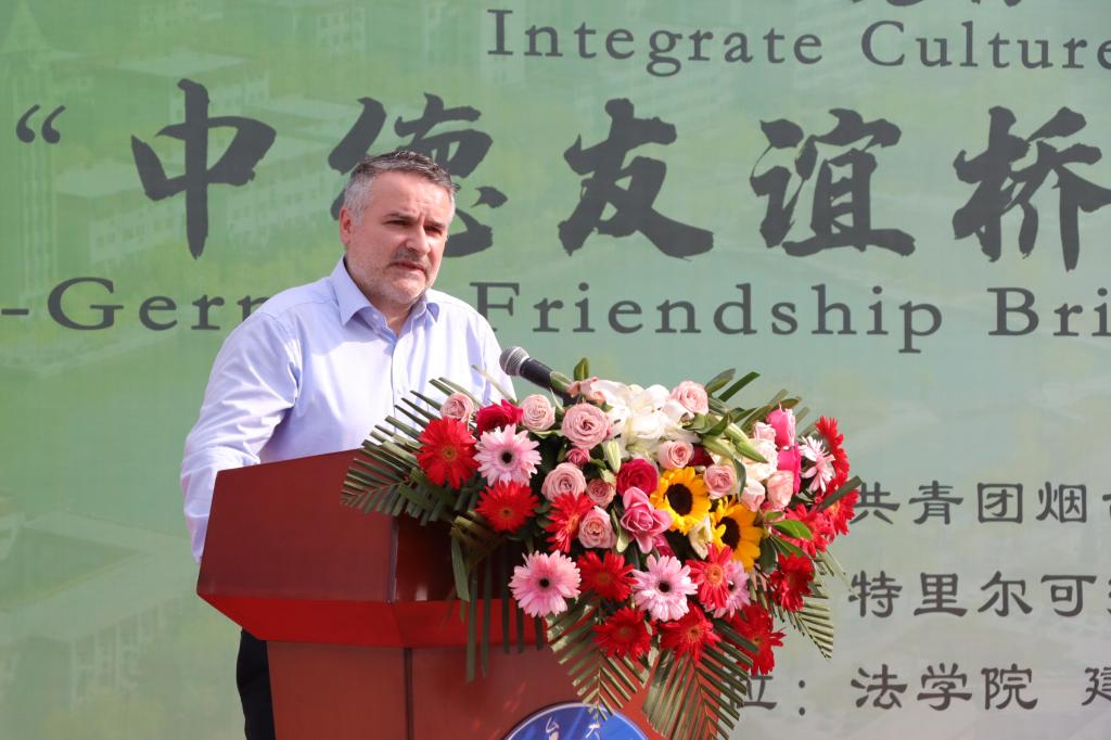 【本站訊】四載耕耘,綠韻流芳。6月5日,學校第四屆“中德友誼橋”文化交流節在育秀廣場舉行。黨委常委、副校長馮素玲,德國特里爾應用技術大學國際項目管理部門負責人Marco Angilella教授出席開幕式并致辭,學生工作處、校團委、國際合作交流處、法學院、環境材料與工程學院、特里爾可持續發展技術學院等單位負責人參加活動。